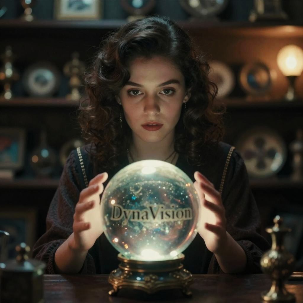 A young woman with curly hair gazes intently into a glowing crystal ball inscribed with 'DynaVision,' surrounded by an antique setting filled with vintage decor. The image captures a mystical and vintage aesthetic, evoking themes of fortune-telling and magical realism.