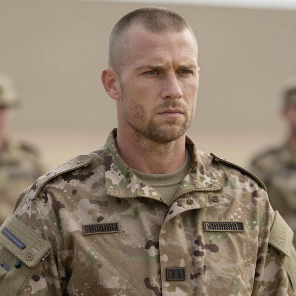 A serious man in military camouflage uniform stands outdoors, focused and resolute. The close-up captures his short hair and beard, highlighting his determination and strength in a military setting.