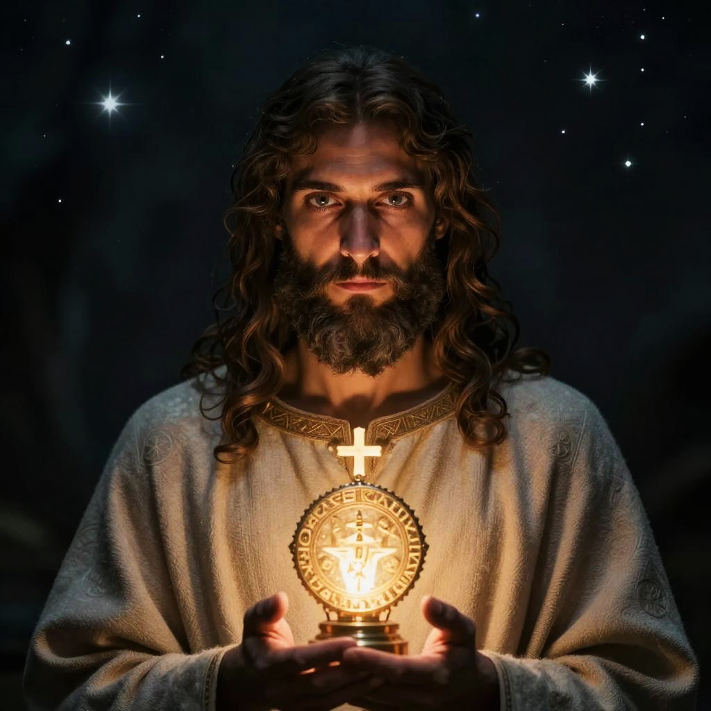 A man with long curly hair and a beard holds a glowing, ornate religious artifact featuring a cross, set against a dark, starry background. The dramatic lighting highlights the solemn expression and intricate details of the ceremonial robe, evoking a spiritual and mystical atmosphere.