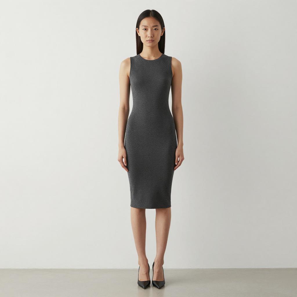A young woman stands confidently against a plain white background wearing a sleek, fitted charcoal gray sleeveless midi dress paired with black pointed-toe heels. The minimalist and modern style highlights clean lines and a streamlined silhouette, perfect for contemporary fashion settings.
