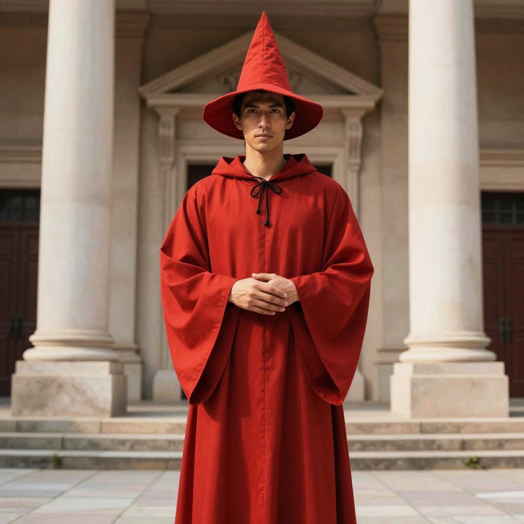 A man stands confidently in front of a classical building wearing a striking red wizard costume, featuring a long robe and a tall pointed hat. The image captures a fantasy-inspired style, blending historical architecture with mystical, medieval costume design.