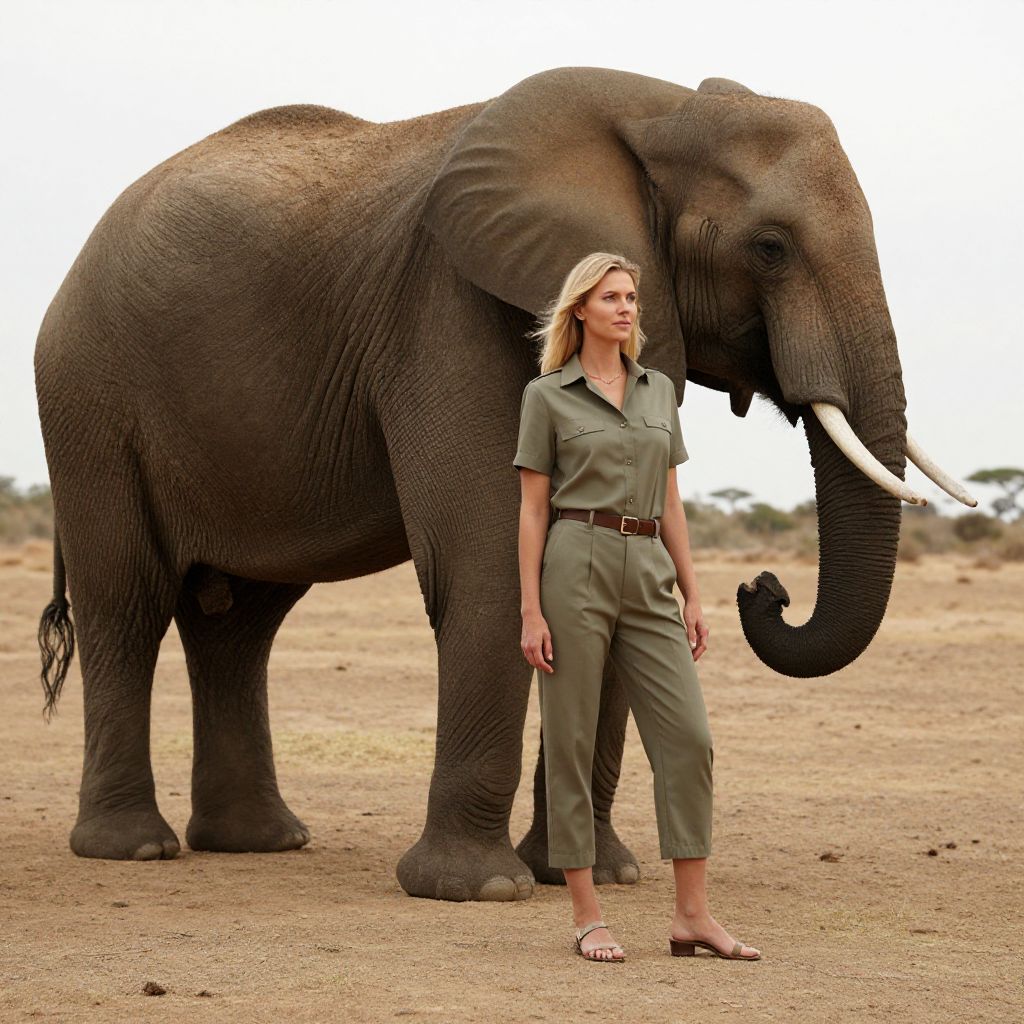 A confident woman stands beside a majestic African elephant in a dry savanna landscape. The image captures the harmonious coexistence between humans and wildlife, highlighting the beauty and scale of the elephant alongside the modern safari-style outfit worn by the woman.