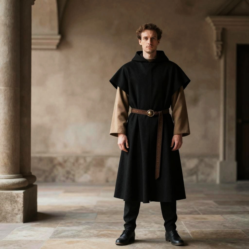 A man dressed in a medieval friar or priest costume stands confidently in a historic stone corridor. His outfit features a black over-robe with a tan under-tunic, cinched at the waist by a decorative brown belt, embodying a traditional medieval clerical style.