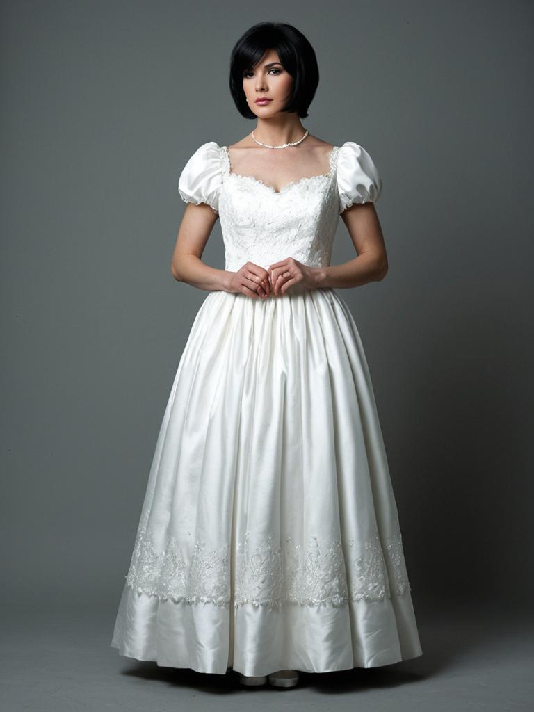Elegant Woman in Vintage White Engagement Wedding Gown with Puffed Sleeves