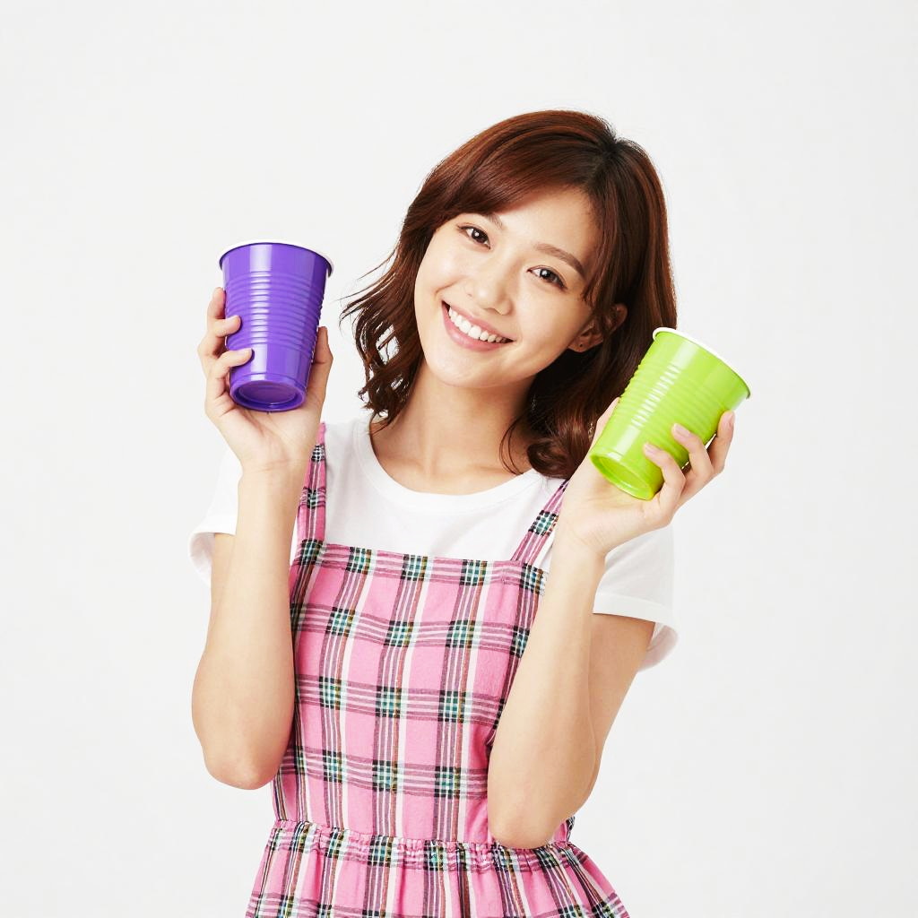 A cheerful young woman wearing a pink plaid dress over a white t-shirt holds up two colorful plastic cups, one purple and one green, against a plain white background. Her smile and casual attire give the image a bright, youthful, and playful vibe, typical of Gen Z style.