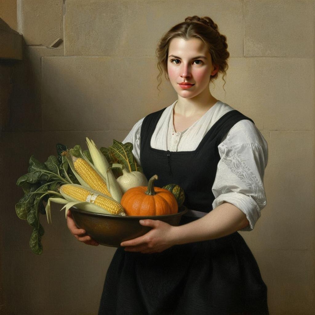 A young woman dressed in traditional attire holds a bowl filled with fresh autumn vegetables, including pumpkins, corn, and leafy greens. The image is styled as a classical portrait with a soft, realistic technique reminiscent of 19th-century European oil paintings.