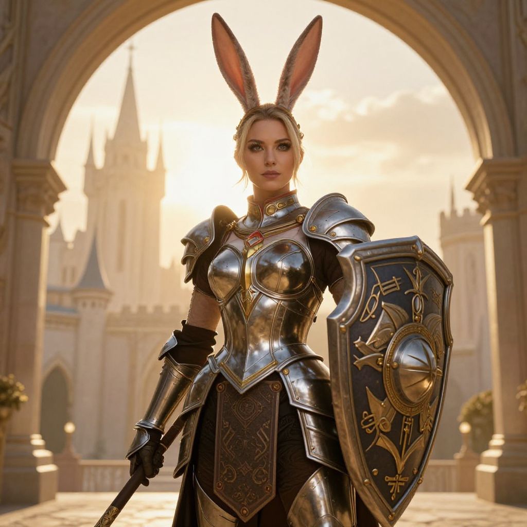 A confident woman stands clad in intricately designed medieval armor, holding a decorated shield and a weapon. She is adorned with large realistic bunny ears, blending fantasy and knightly elements against the backdrop of a grand, castle-like structure illuminated by warm sunlight.