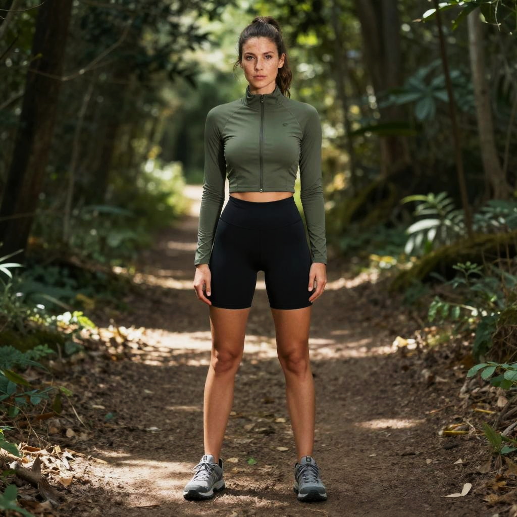 A fit woman stands confidently on a sunlit forest trail, dressed in a cropped olive green long-sleeve top and black high-waisted athletic shorts. The natural surroundings and her sporty outfit convey an active lifestyle and outdoor fitness theme.