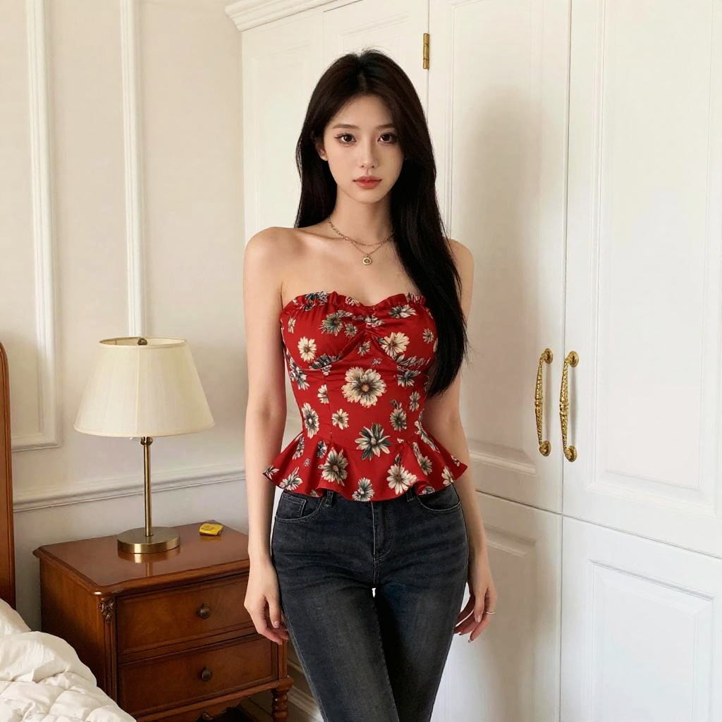 Young Woman in Red Floral Strapless Top and Dark Jeans Indoor Fashion