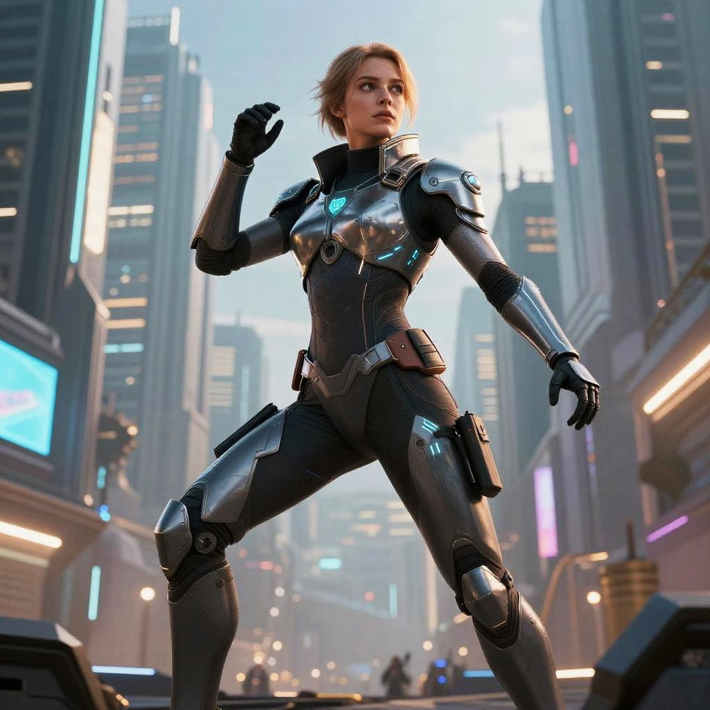 A confident woman in sleek futuristic armor stands poised in a high-tech cyberpunk cityscape, showcasing glowing neon accents and detailed metallic plating. The scene embodies a blend of advanced technology and modern urban energy, emphasizing strength and determination in a sci-fi setting.