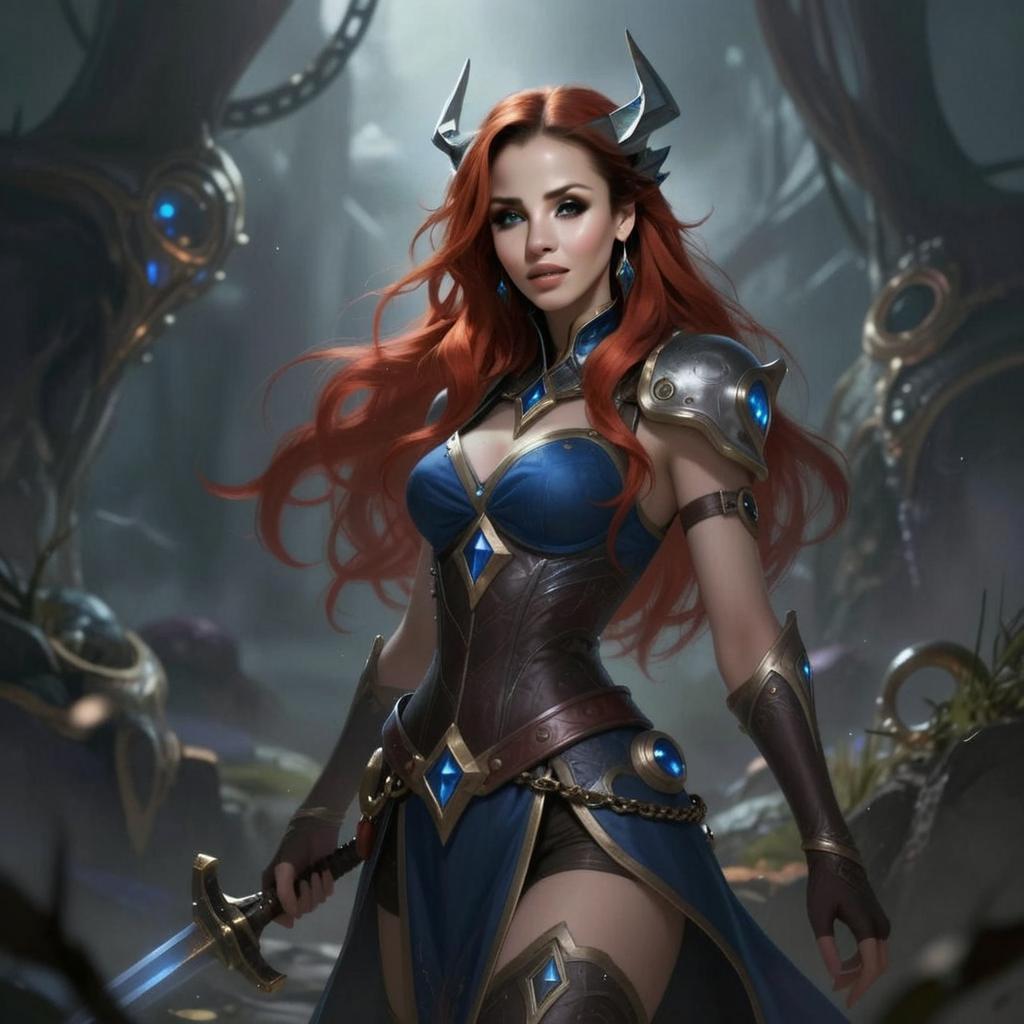 A stunning red-haired woman warrior stands confidently in a fantasy setting, clad in detailed blue and brown armor adorned with glowing blue gems. Her flowing hair and intricate metal accessories give her a powerful and enchanting appearance, blending elements of fantasy and steampunk styles.