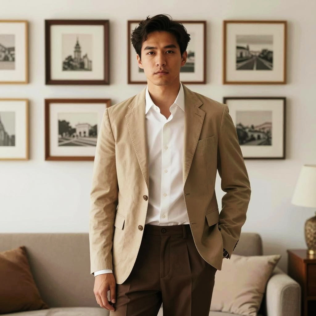 A young man dressed in a beige blazer, white shirt, and brown trousers stands confidently in a stylish living room. The background features a modern sofa with cushions and a wall adorned with framed black-and-white architectural photographs, creating a sophisticated and minimalist ambiance.
