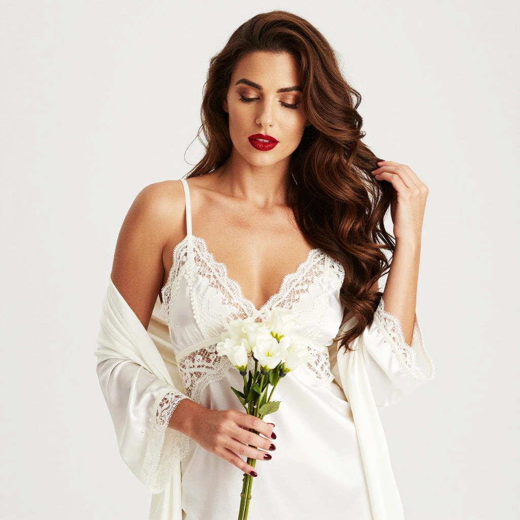 A beautiful woman with long, wavy brown hair and bold red lipstick is dressed in elegant white lace lingerie and a matching robe. She gently holds a small bouquet of white flowers, exuding a serene and sophisticated bridal vibe against a plain light background.