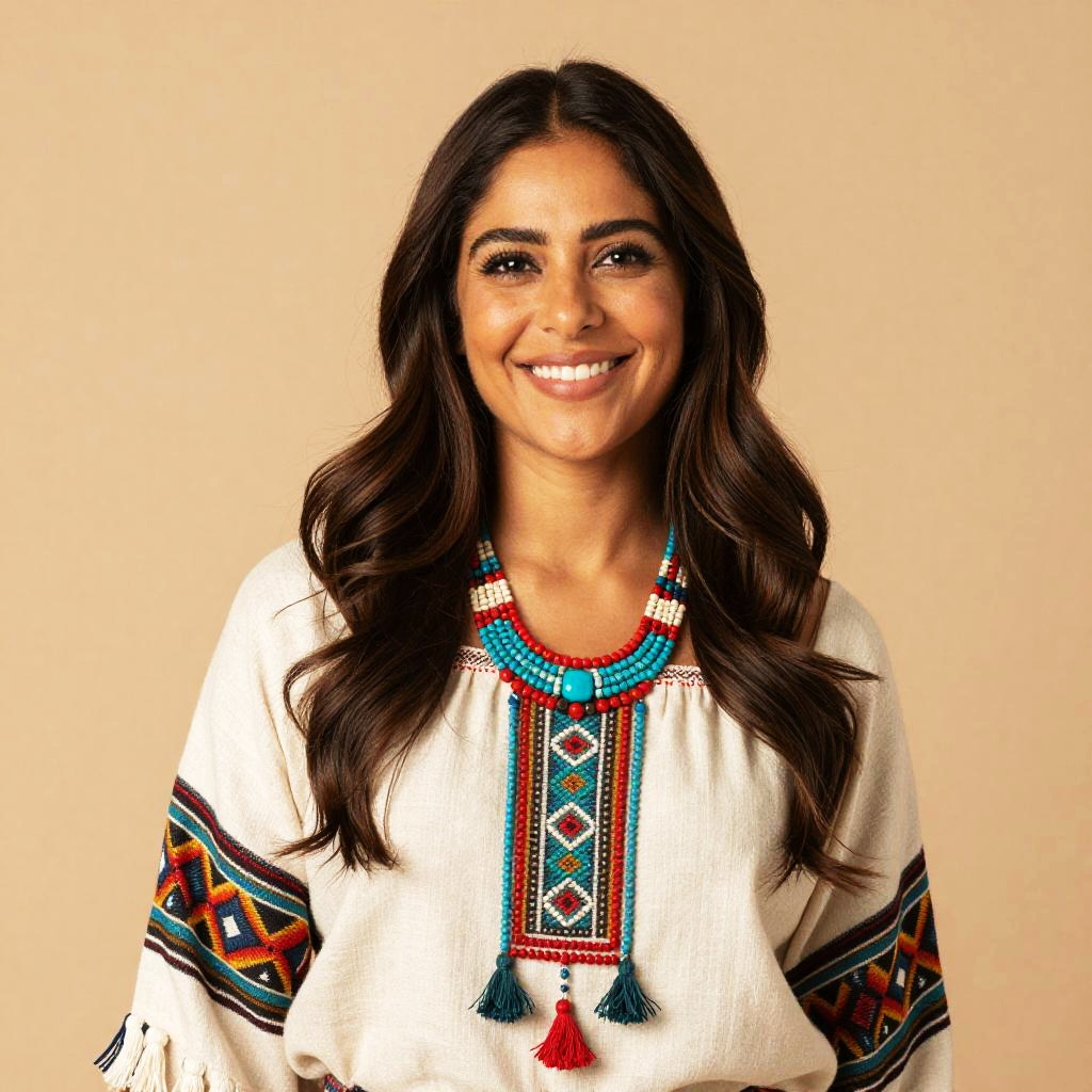 A smiling woman with long dark hair wears a cream-colored traditional blouse adorned with colorful geometric embroidery and tassels. She accessorizes with a matching beaded necklace that highlights the vibrant patterns, all set against a warm beige background, evoking a modern bohemian style.
