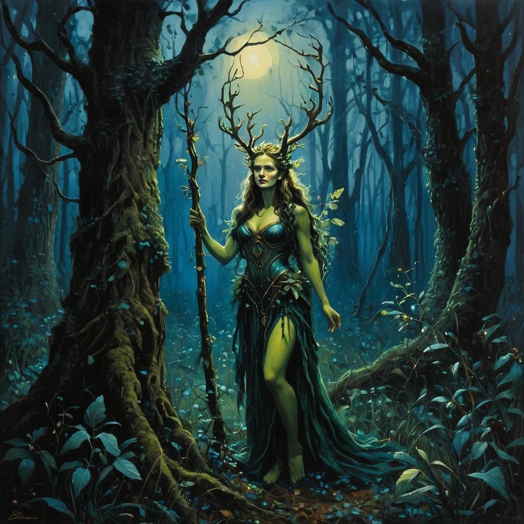A mystical woman stands in an enchanted forest bathed in moonlight, adorned with elaborate antler-like branches on her head and wearing a flowing, dark green gown that blends with the woodland surroundings. She holds a staff entwined with vines, embodying the spirit of nature in a highly detailed, fantasy art style with rich, atmospheric lighting.