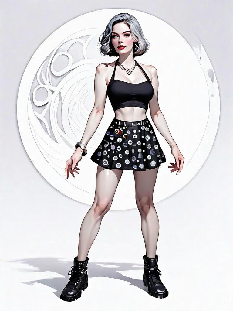 The image features a full-body digital illustration of a confident young woman standing in front of a stylized circular backdrop. She is dressed in a black crop top and a short skirt adorned with colorful circular patterns, paired with chunky black boots, embodying a modern casual style. The artwork exhibits a realistic comic-inspired style with sharp detailing and a clean, polished finish.
