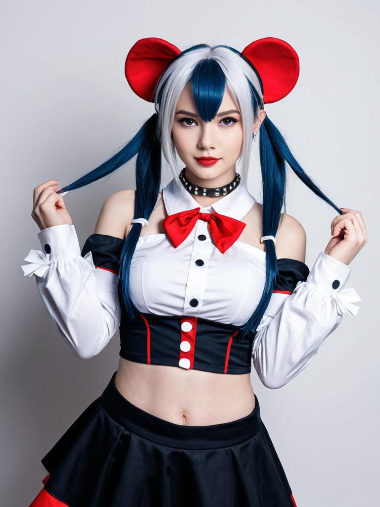 A young woman poses in a vibrant cosplay outfit inspired by the character Hakos Baelz, featuring striking blue and white hair styled in twin tails with large red mouse ear accessories. She wears a stylish black and white top with red accents and a matching skirt, complemented by a red bow tie and a studded choker, blending playful and edgy elements in this high-quality portrait shot.