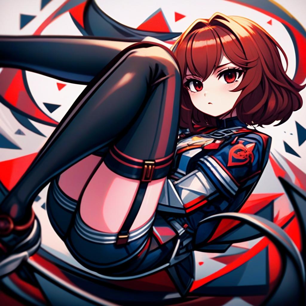 This digital artwork features a stylized anime girl with short, auburn hair and striking red eyes, dressed in a futuristic, dark-colored outfit accented with red and white details. The composition highlights dynamic poses with a detailed uniform, rendered in a vibrant anime style characterized by clean lines and bold colors. The background includes abstract red and white geometric shapes, enhancing the energetic and modern feel of the piece.