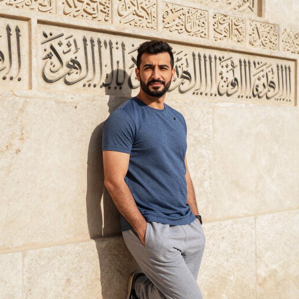 A man stands casually against a beige stone wall adorned with intricate Arabic calligraphy. He is dressed in a blue t-shirt and light gray pants, looking confidently at the camera in natural daylight, capturing a modern yet culturally rich ambiance.