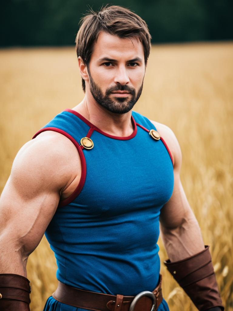 A muscular man stands confidently in a blue sleeveless tunic with gold button details and leather bracers, set against a golden wheat field background. His intense gaze and strong physique give him a heroic and historical warrior appearance, reminiscent of medieval or fantasy aesthetics.