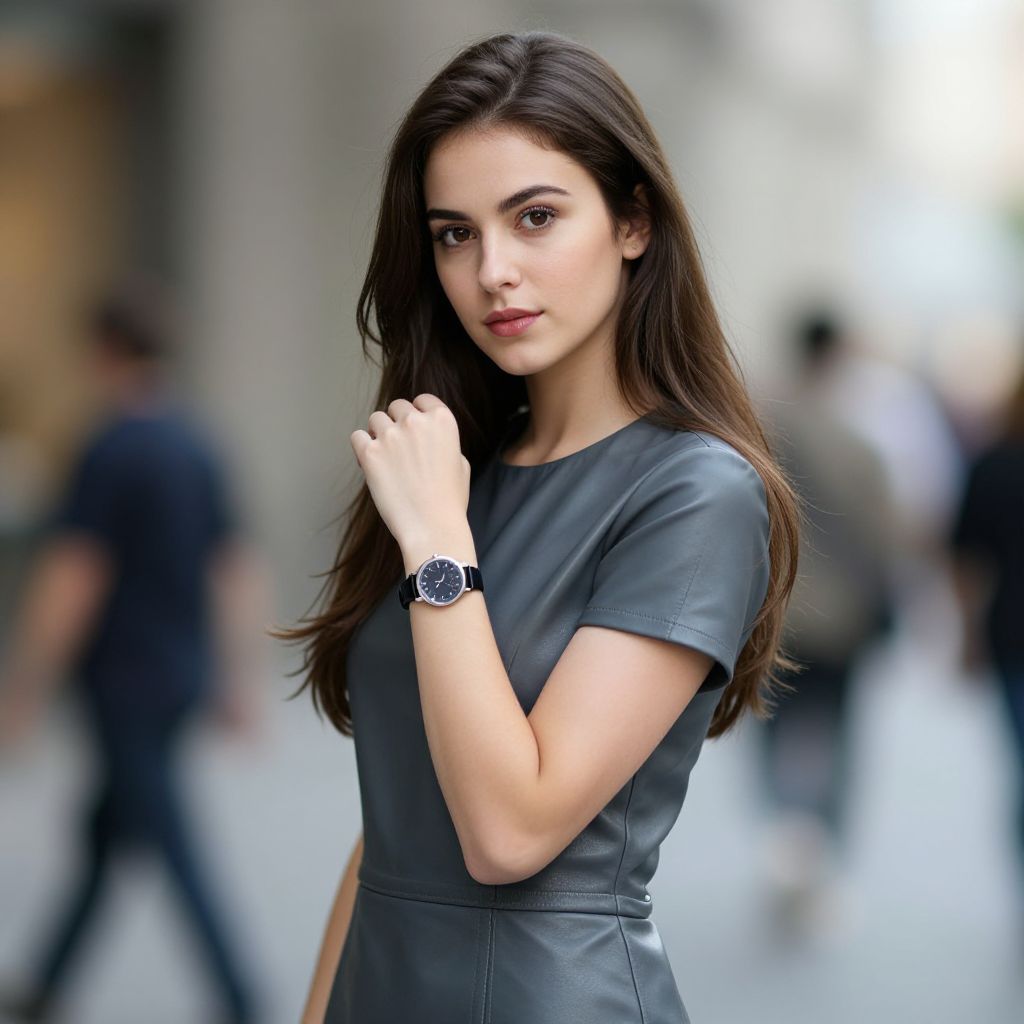 A confident young woman with long brown hair stands in an urban setting, wearing a sleek grey leather dress and a black wristwatch. The softly blurred background emphasizes her poised expression and stylish appearance.