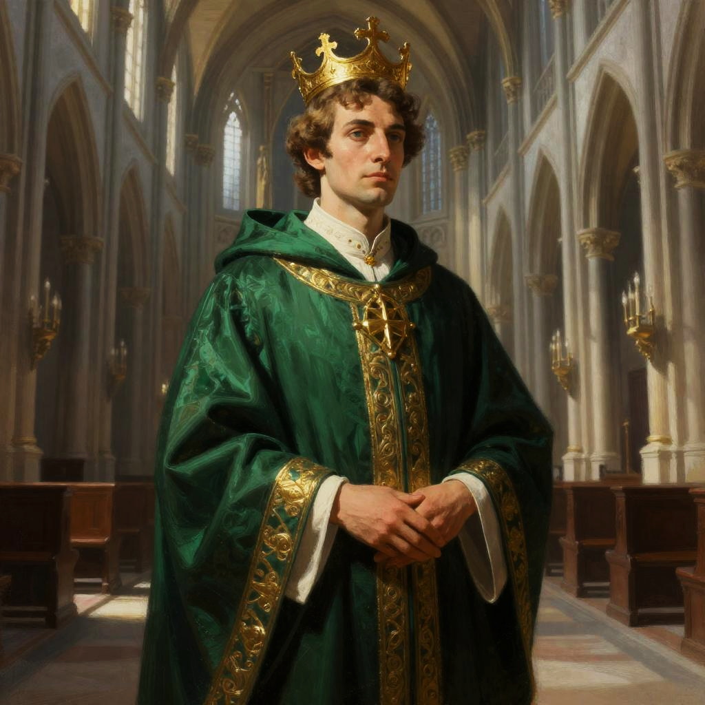 A regal young man dressed as a king stands solemnly inside a grand gothic cathedral, adorned in a luxurious green robe with intricate gold embroidery and a shining golden crown. The image captures a classical, realistic painting style with attention to detail and dramatic lighting that emphasizes the subject's noble demeanor.