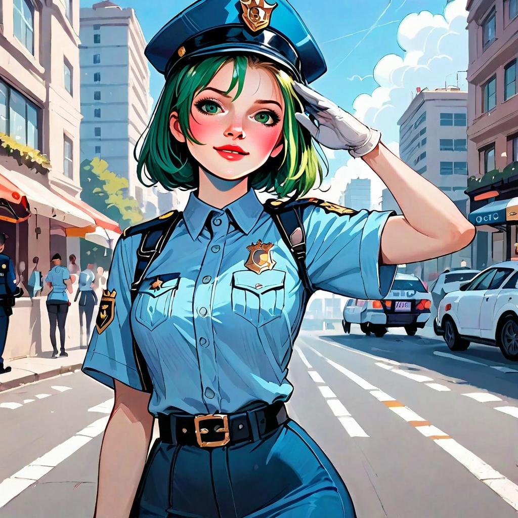This vibrant digital illustration depicts a young woman in a police uniform standing confidently on a busy urban street. The artwork features bright colors and a semi-realistic anime style, highlighting the character's green hair and expressive eyes against a cityscape backdrop with cars and pedestrians.