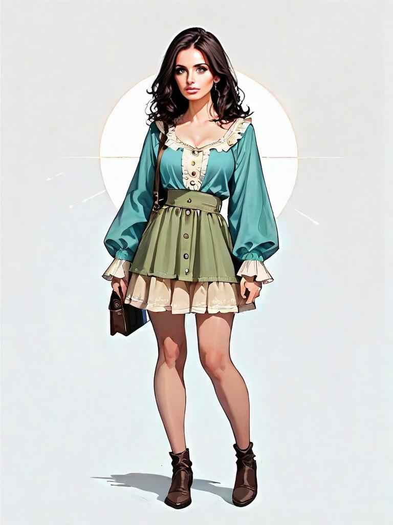 A stylish woman is depicted in a full-body realistic comic-style illustration featuring a bohemian outfit. She wears a teal long-sleeve blouse with ruffled details paired with a high-waisted green skirt layered over a cream-colored underskirt, complemented by ankle boots and a small handbag.