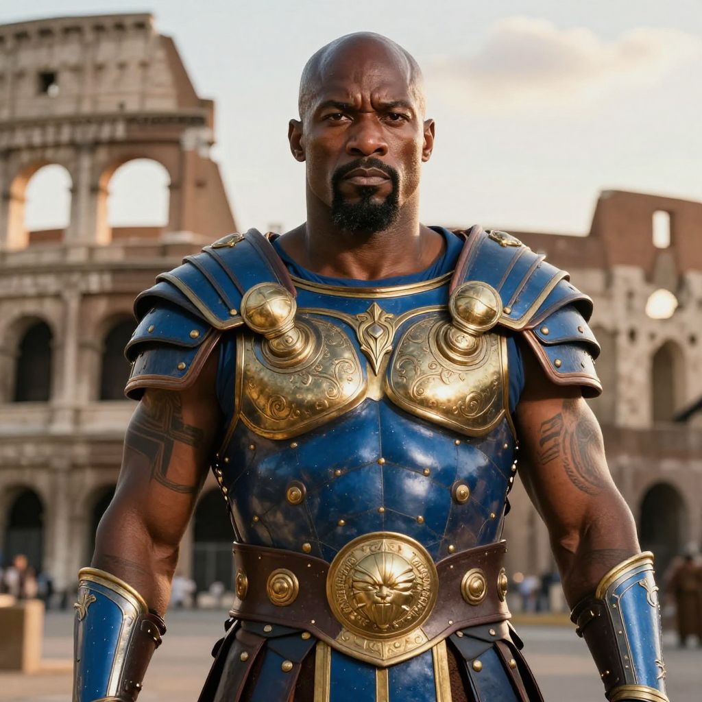 A powerful man dressed in ornate blue and gold Roman-style armor stands confidently in front of the historic Colosseum. His intense expression and detailed costume highlight the ancient warrior theme in a dramatic outdoor setting.