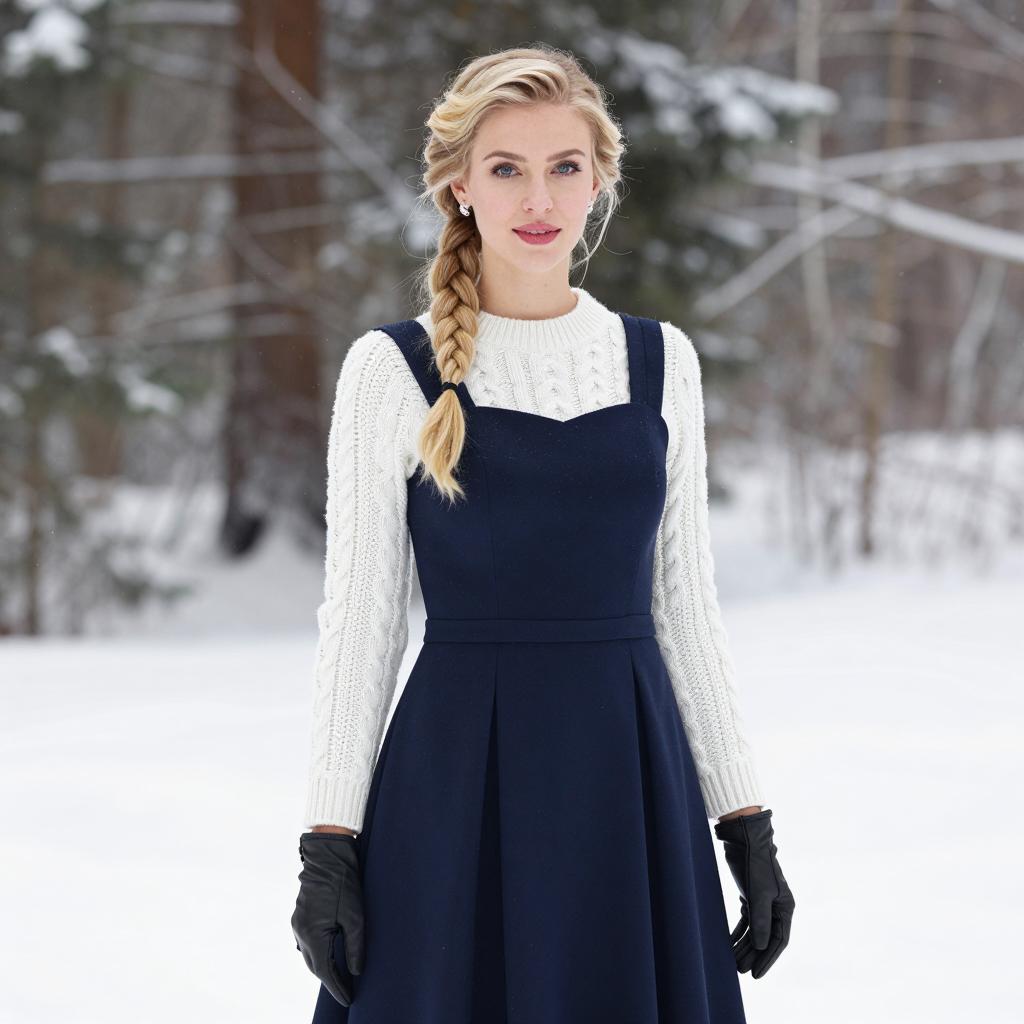 A young woman with blonde hair styled in a loose braid stands outdoors in a snowy landscape. She is dressed in a classic navy blue dress layered over a white cable-knit sweater, paired with black leather gloves, capturing a chic winter style with cozy and elegant elements.