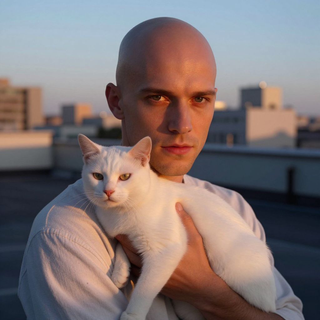 A man with a shaved head holds a white cat close to his chest during golden hour, with soft sunlight highlighting their features. The urban rooftop background creates a calm and intimate atmosphere in this portrait.