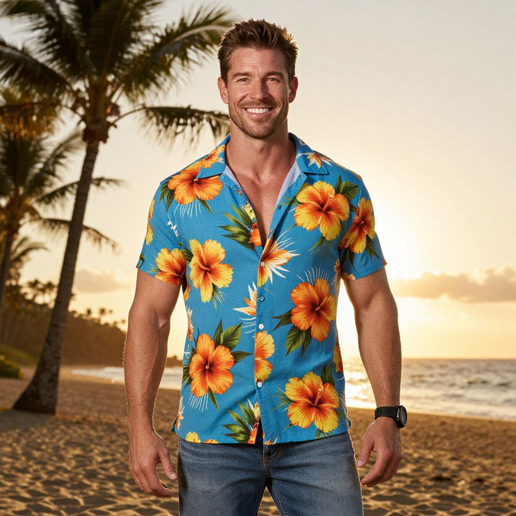 A smiling man stands on a tropical beach at sunset, wearing a vibrant blue Hawaiian shirt with large orange and yellow hibiscus flowers. Palm trees and the ocean create a serene and warm backdrop, evoking a relaxed vacation vibe.