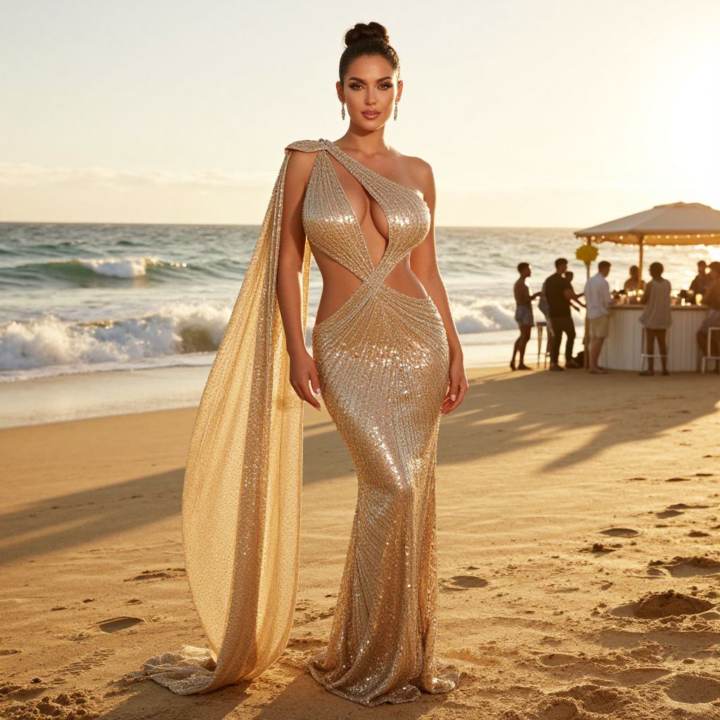 A glamorous woman poses on a sandy beach at sunset wearing an elegant, shimmering gold sequin gown with dramatic cutouts and a flowing cape detail. The background features gentle ocean waves and a relaxed beach gathering, creating a sophisticated and serene atmosphere.