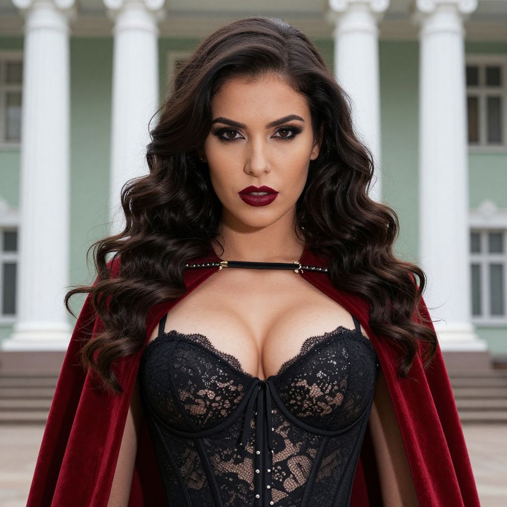 A confident woman with long, wavy dark hair poses outdoors in front of classical architecture. She wears a striking black lace corset and a deep red velvet cape, complemented by bold makeup featuring dark red lipstick and dramatic eye makeup.