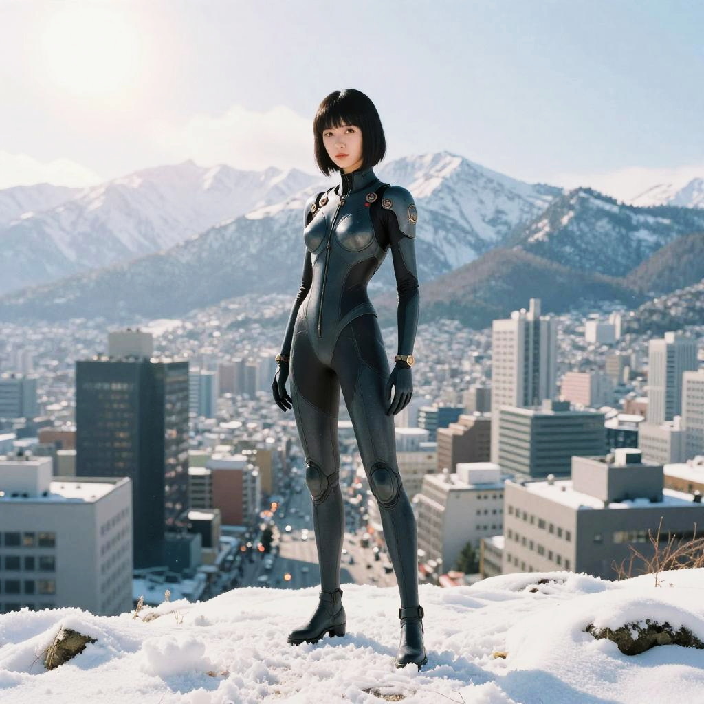A woman stands confidently on a snowy hill overlooking a cityscape with snow-capped mountains in the background. She is dressed in a sleek, futuristic black bodysuit, blending elements of sci-fi and modern cyberpunk style.