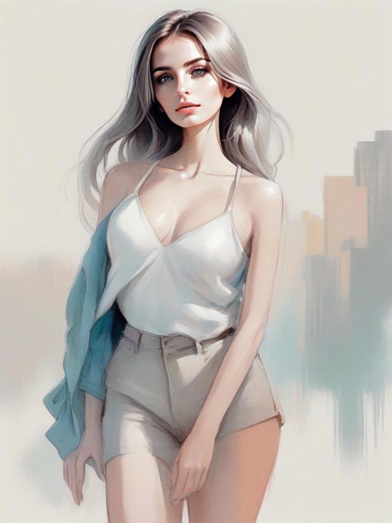 This captivating portrait features a woman with long, flowing black hair and striking red lips, exuding confidence and elegance. Her green dress complements the soft, neutral background, creating a harmonious balance that draws the viewer's attention. The artwork reflects a contemporary illustrative style, characterized by its smooth lines and vibrant color palette.