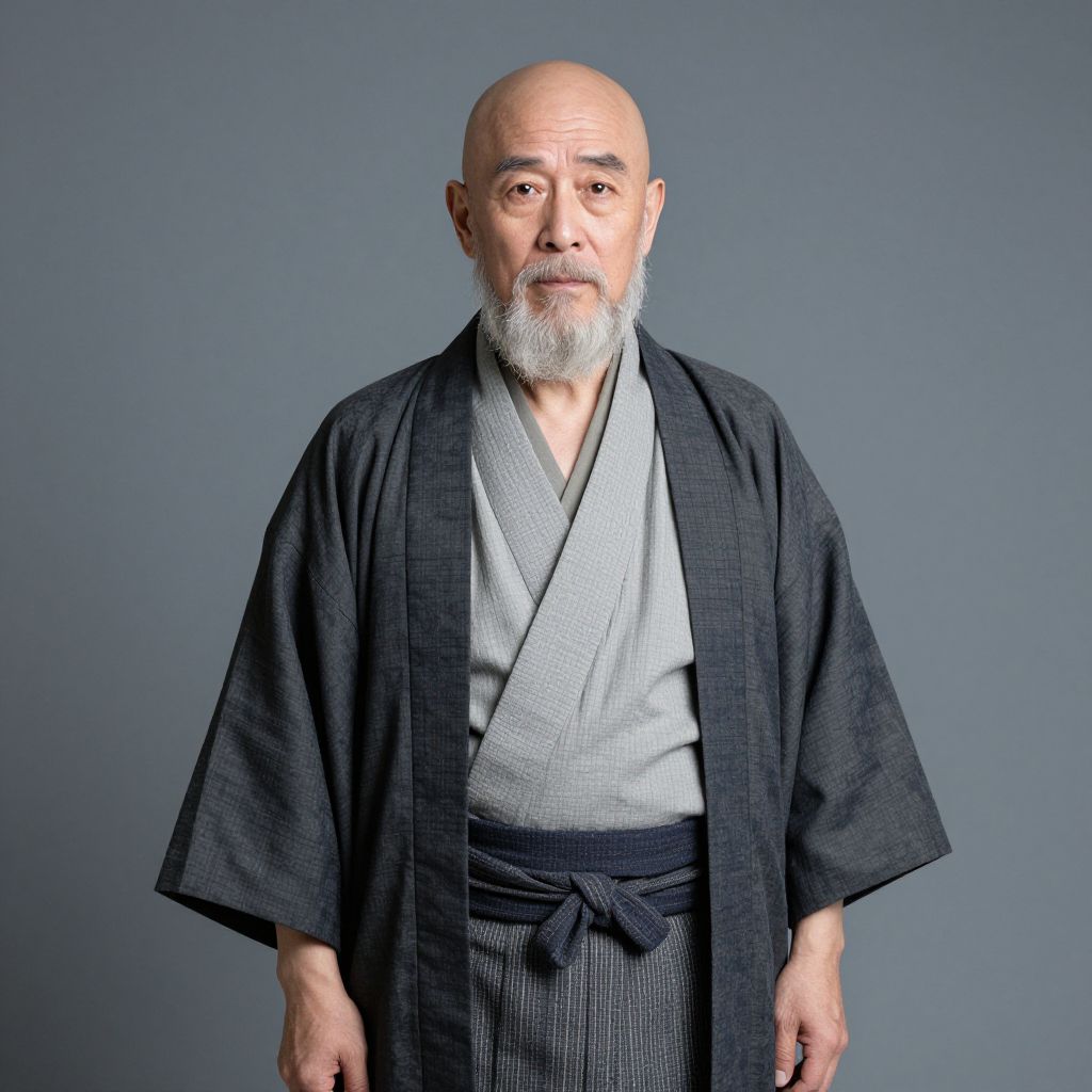 An elderly man with a white beard and bald head is dressed in traditional Japanese clothing, including a kimono and a haori jacket, standing against a plain gray background. His calm and dignified expression highlights the timeless elegance and cultural heritage embodied by his attire.