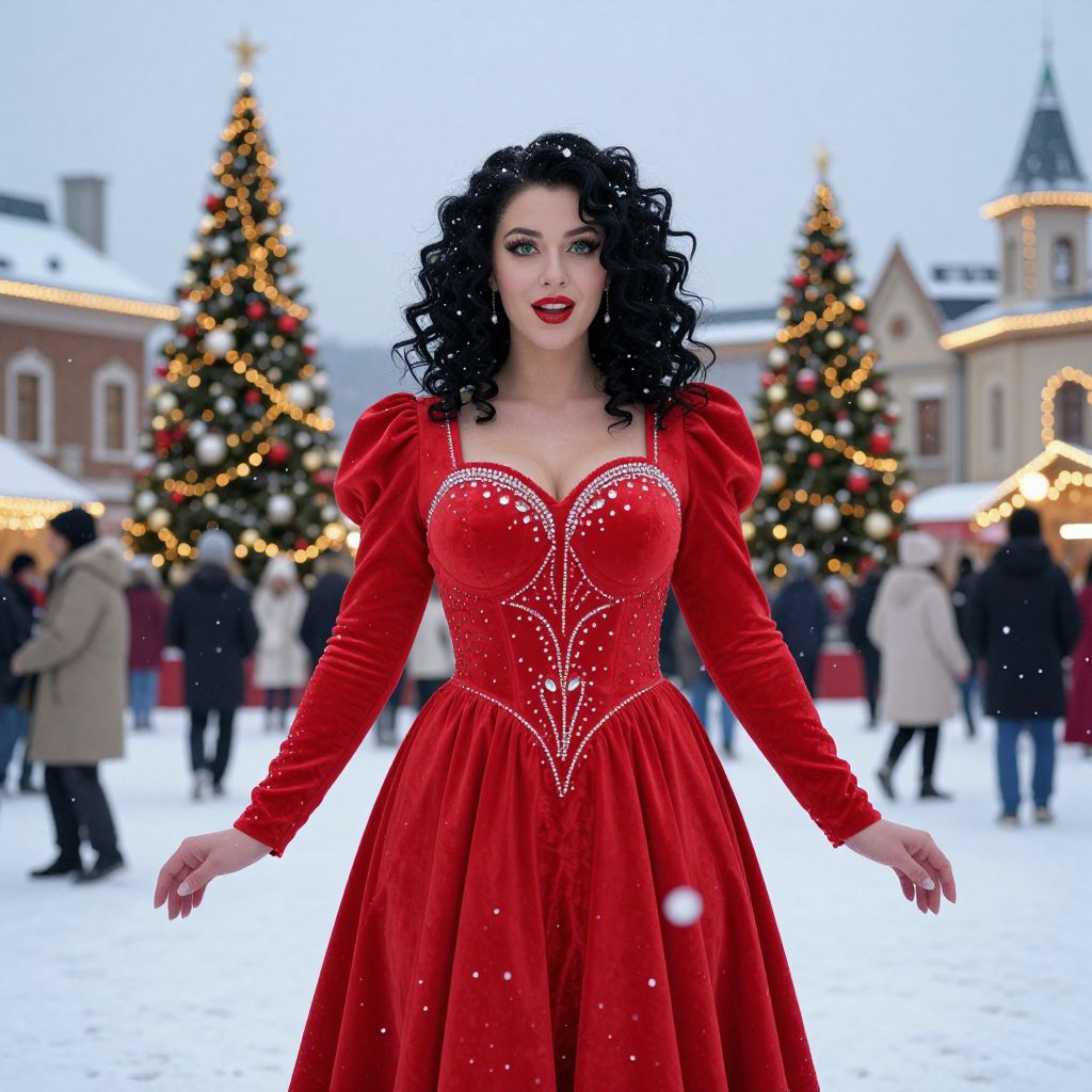 A woman dressed in an elegant red velvet gown adorned with sparkling embellishments stands in a festive winter setting with snow falling around her. The background features beautifully decorated Christmas trees and softly lit buildings, creating a magical holiday atmosphere.