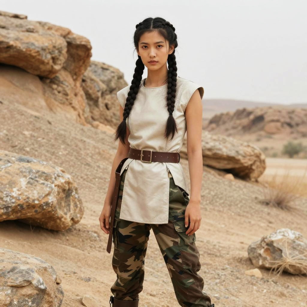 A confident young woman stands in a rocky desert landscape, sporting a contemporary military-inspired look. She wears a sleeveless beige top cinched with a brown belt, paired with camouflage cargo pants and black boots, complemented by her long braided hair.