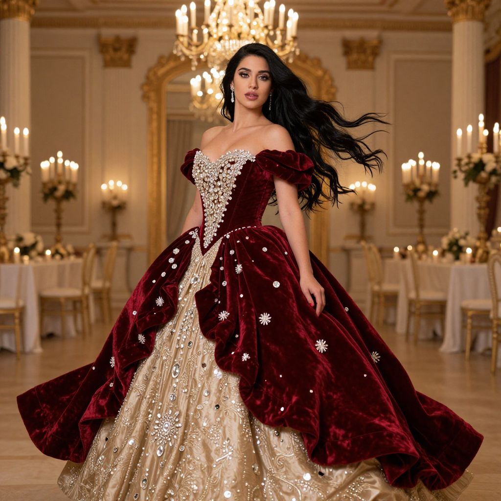A woman elegantly poses in a luxurious ballroom wearing a regal burgundy and gold embellished ball gown. The off-shoulder velvet bodice adorned with intricate beadwork complements the voluminous skirt, creating a stunning and sophisticated look in a classic opulent setting.