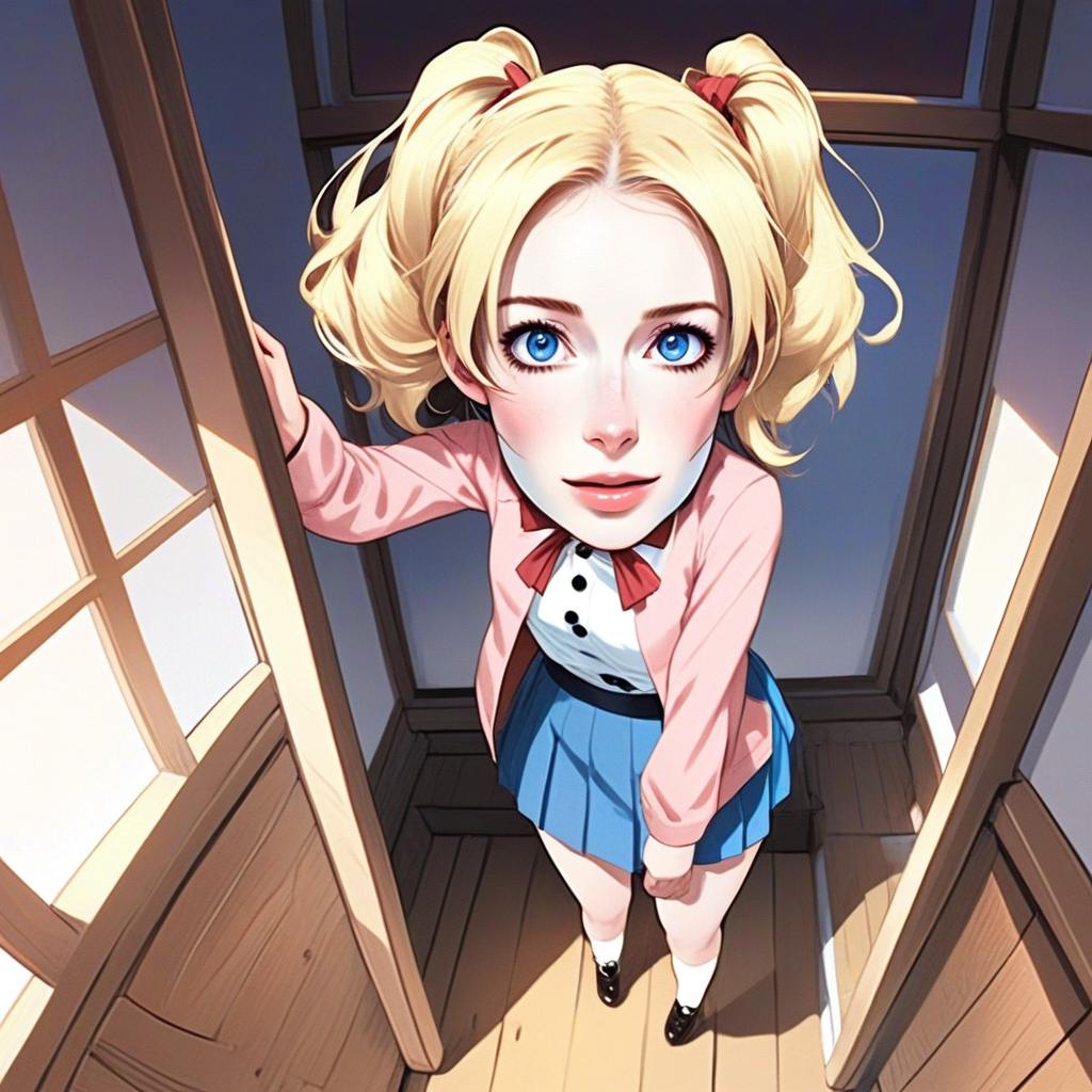 This anime-style illustration features a young woman with striking blue eyes and blonde hair styled in twin pigtails. Dressed in a pink cardigan, white shirt with a red bow tie, and a blue pleated skirt, she stands in a wooden room with an expressive and curious gaze directed upwards, captured from a high-angle perspective.