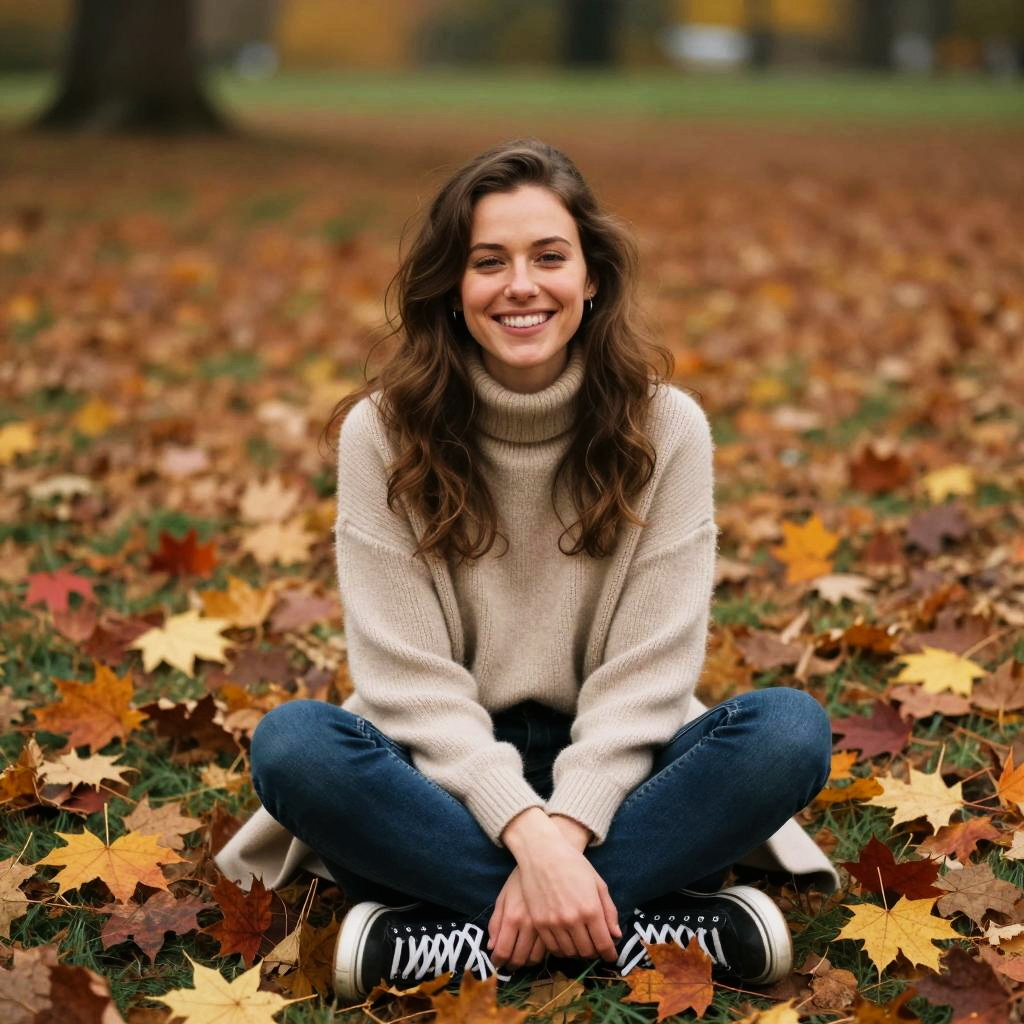 A young woman sits cross-legged on the ground covered with colorful autumn leaves, wearing a cozy beige turtleneck sweater and blue jeans. She smiles warmly, surrounded by the soft, blurred backdrop of a park, capturing a serene and natural fall moment.