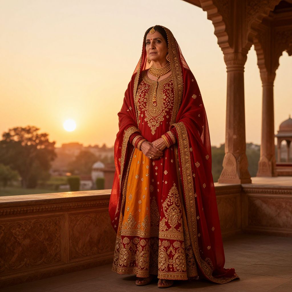 A dignified woman dressed in an elegant traditional Indian outfit stands poised in a richly decorated architectural setting at sunset. Her red and orange attire is adorned with intricate gold embroidery, complemented by traditional jewelry, radiating cultural heritage and grace.