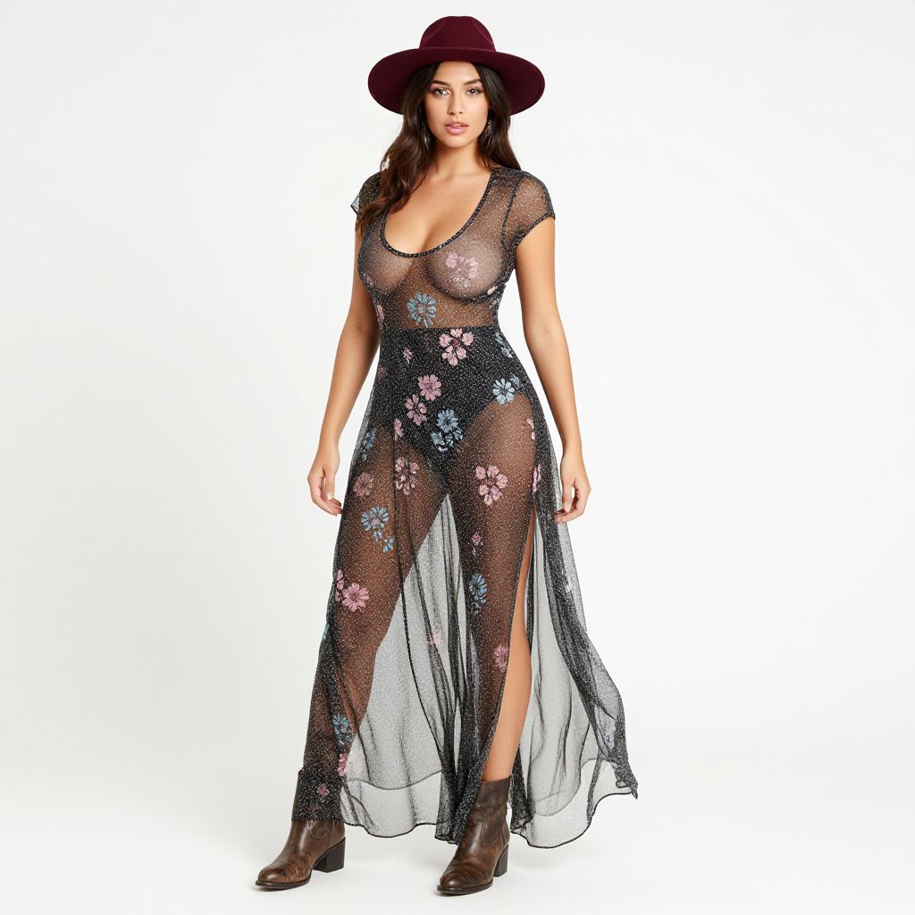 A confident woman models a sheer black maxi dress adorned with blue and pink floral patterns, paired with a burgundy wide-brimmed hat and brown ankle boots. The dress features short sleeves, a deep scoop neckline, and side slits, showcasing a bold and stylish contemporary fashion look.