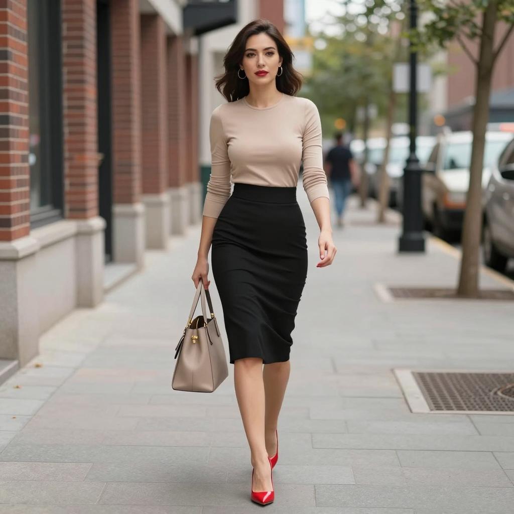 A confident woman walks on an urban sidewalk dressed in a chic beige long-sleeve top and a fitted black pencil skirt. She accessorizes with red high heels, hoop earrings, and a stylish taupe handbag, embodying contemporary Gen Z professional fashion.