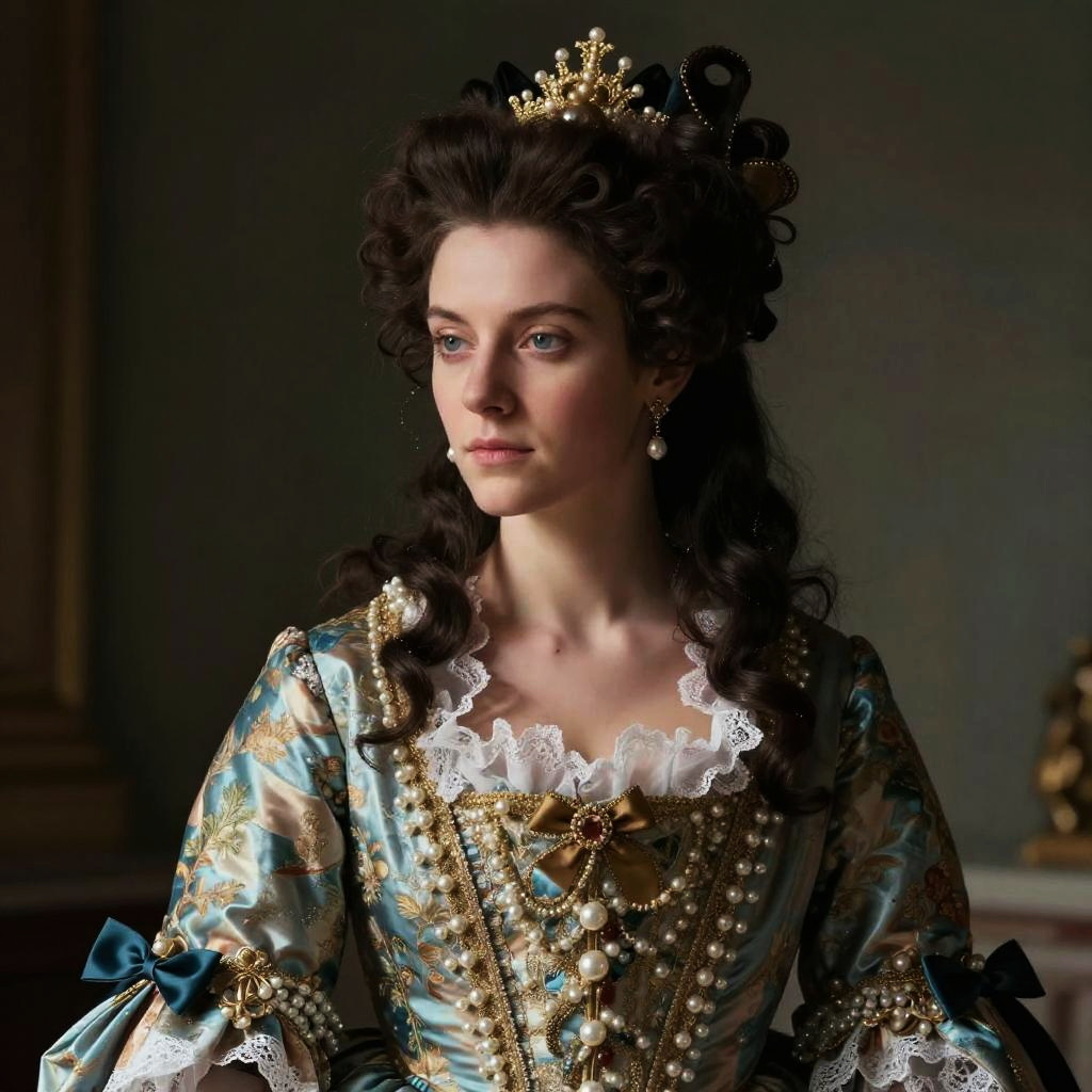 A woman dressed in an elaborate 18th-century Rococo-style gown adorned with intricate gold embroidery, pearls, and lace, stands gracefully with a composed expression. Her dark curly hair is styled in an elaborate updo, topped with a decorative golden crown, capturing the essence of regal elegance and vintage aristocratic fashion.