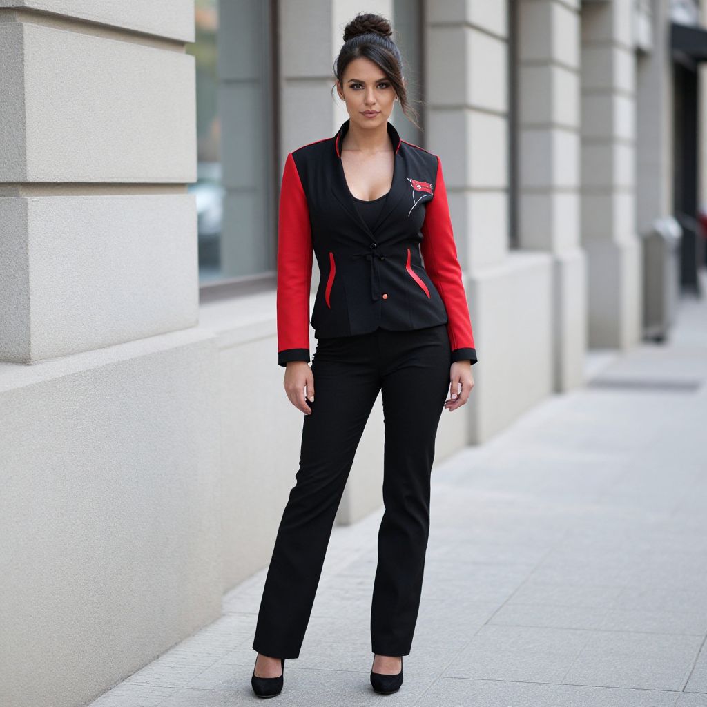 A confident woman stands poised on an urban sidewalk, wearing a stylish black and red fitted blazer with matching black pants and heels. The modern outfit highlights a professional yet chic look, set against a backdrop of contemporary architecture with clean lines.