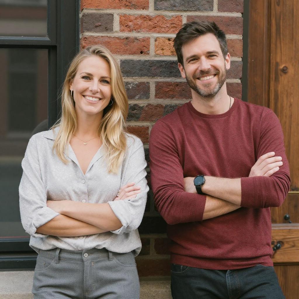 A smiling young woman and man stand confidently with their arms crossed against a brick wall background, radiating a sense of joy and camaraderie. The casual and natural setting highlights their relaxed, friendly expressions, capturing a genuine moment of connection.