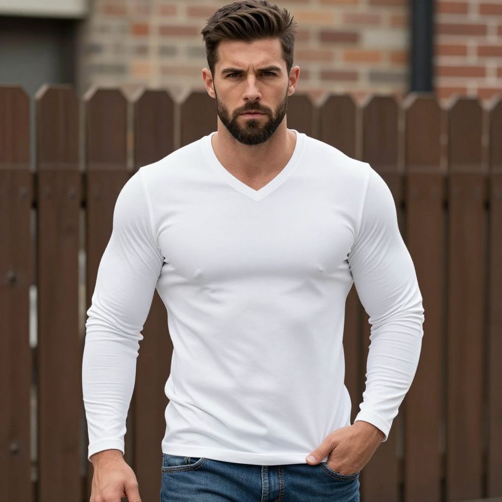 A confident young man with a beard is wearing a fitted white long-sleeve V-neck shirt paired with blue jeans, standing outdoors in front of a wooden fence and brick wall. The image exudes a casual, modern style with the focus on his strong physique and focused expression.