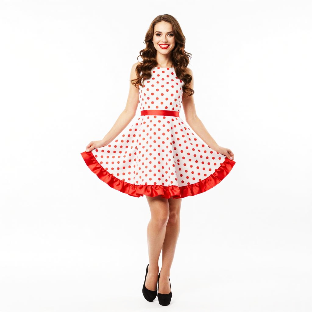 A cheerful young woman poses in a vibrant retro-style polka dot dress featuring red dots and a matching red ruffled hem and belt. Her wavy hair and bright red lipstick complement the vintage 1950s-inspired look against a clean white background.